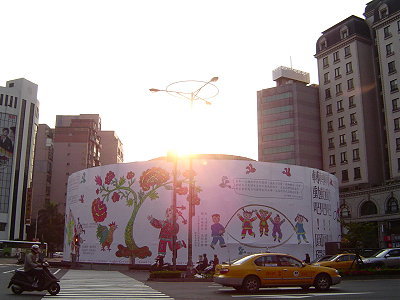 圓環在前幾天被廣告帆布圍起來了,似乎是要重新改建。帆布上除了有傳統圖案的娃娃插畫,還有地方文人仕紳的祝福。早上上班時正好迎著朝陽,似乎看見圓環再起的一個新希望。(只能說希望,沒辦法有太多期望......囧rz )真要感謝台灣的選舉文化,在這種政策窗打開的時候,政客們總算會小小的對人民期望有所反應。但身為在地人,真的希望能如同黃春明先生在帆布上的祝福:「轉動吧,轉動吧,圓環!」