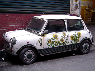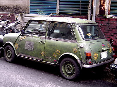 學校附近有個花店,門口停了兩輛可愛的mini小車。我猜測應該是花店老闆的車吧!因為車上畫著很有風格的花卉。對這種在車子上作畫的舉動,我覺得非常大膽!因為畫爛了就爛了!XD跟之前我在迪化街照到的那台彩繪大休旅,這兩台的手工感就非常明顯!畫上去,和開出去,這真是需要很大的自信啊...老闆!了不起!XD(拇指)忘記我說的彩繪大休旅是什麼樣了嗎?在這裡:有趣的車身彩繪